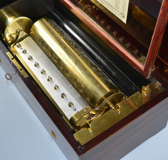 Fine Swiss music box by Nichole Freres. Playing 12 airs on a fat cylinder housed in original case with very unusual inlaid top with cats at play. Excellent condition and replacement tune sheet. Cylinder is 31 cm (length).