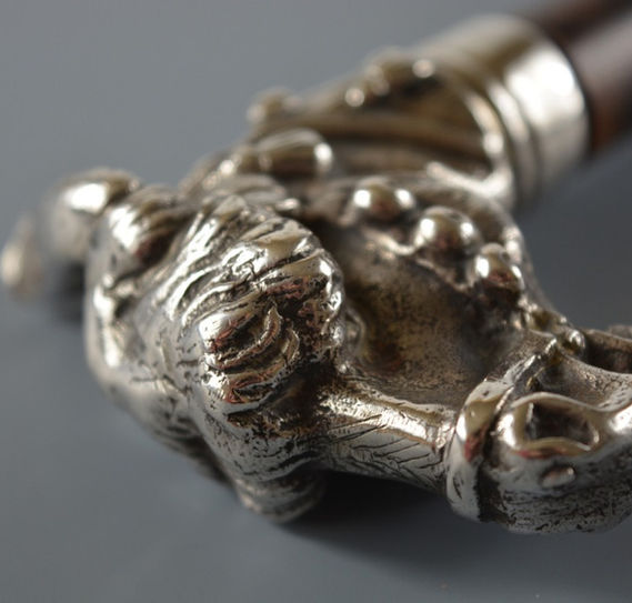 Silver donkey head top walking cane. Painted effect finish, to wooden shaft.
